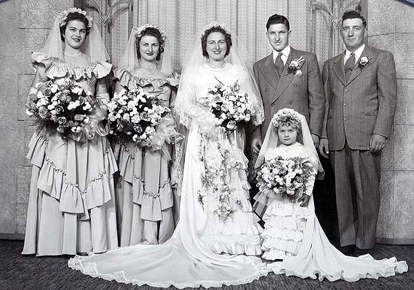 (left to right standing - Martha Kirschling, ?, Cecelia Wroblewski, Raymond Kirschling, Florian Wroblewski, front - flower girl ?)