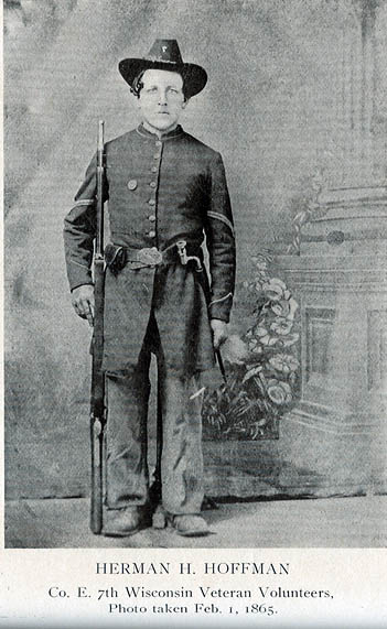 Herman H. Hoffman, as already indicated, was twelve years of age when brought to America by his parents. He had received most of his schooling in the old country, and he came to manhood with practically no knowledge of the English language except the ability to use some of the more common words in speech. He was twenty years old when October 20, 1864, he enlisted at LaCrosse, Wisconsin, in Company E of the Seventh Wisconsin Infantry. It was in the army that the need for an English education was forcibly brought home to him. He wanted to send some message home, and for that purpose sought out his most intimate comrade, asking him to write a letter. This comrade he discovered was unable to write and Mr. Hoffman realized that his deficiency was not only working a present hardship so far as communication with home and friends was concerned, but the same might prove a permanent bar to his advancement in a business way. He therefore determined without loss of time to acquire a knowledge of the English language. Of course his early education in the German tongue served him to good purpose, and he began reading newspapers and books even without understanding what he read and practiced writing on every scrap of paper he could find about the camp. Thus he largely educated himself by self application and his war experience was really his principal school after coming to America. That in no wise prevented him from serving capably as a soldier. He was with his regiment on all duties until honorably discharged July 3, 1865. The captain of his company, William H. Gildersleeve, wrote on the back of his discharge a very complimentary note saying that Mr. Hoffman had been a most faithful soldier under all circumstances, and that on one occasion he had left the hospital at his own volition and joined the regiment on hearing that his comrades had received marching orders.