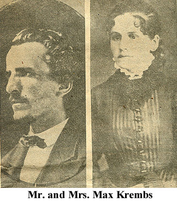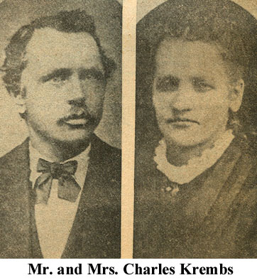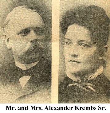 the business until his own death in January 1911. The Krembs Hardware Co. was incorporated in 1911 with Fritz A. and Anton C. Krembs, sons of Alexander, as president and treasurer, respectively. Max Krembs died in 1931. Charles Krembs’ wife was the former Catherine Streckel. Mrs. Alexander Krembs was the former Elizabeth Biegler.