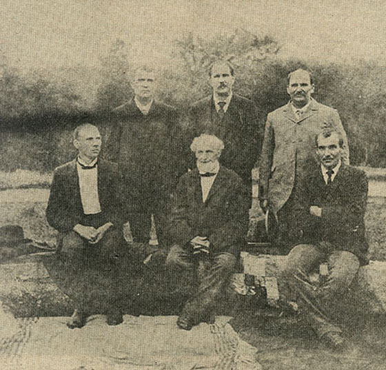 AMONG THE FIRST to engage in business in Stevens Point was Jesse Martin, seated in center, who came here in 1846 and with his brother built a store at Clark and S. 2nd streets. He is pictured here many years ago with five of his sons. Seated at left is Glenn Martin, now of Bemidji, Minn., and at right Stiles A. Martin, 1517 Main Street. Standing from left are, Delbert Martin, Brayton Martin and Theron Martin, the oldest son. |