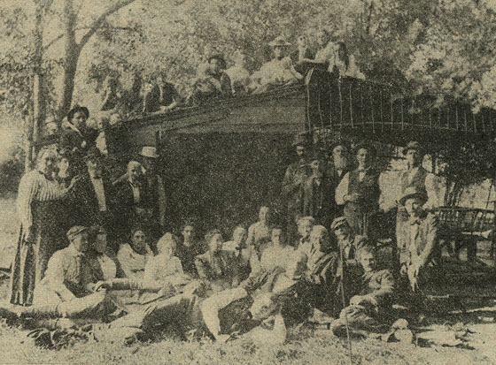 THE MARTIN FAMILY reunion held on Martin's Island in 1900 is pictured above. Standing at extreme left, with dotted skirt and white blouse, is Mrs. Jesse Martin, the former Mercy Content Vaughan. Next to her is her husband, who came to Stevens Point in 1846. |